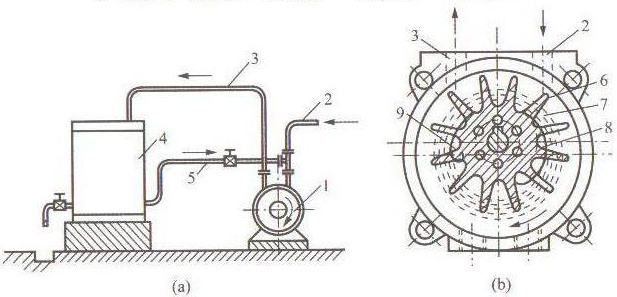 1-真空泵;2-抽氣管;3-排氣管;4-水氣分離箱;5-循環(huán)水管;6-葉輪;7-水環(huán);8-進(jìn)氣孔;9-排氣孔